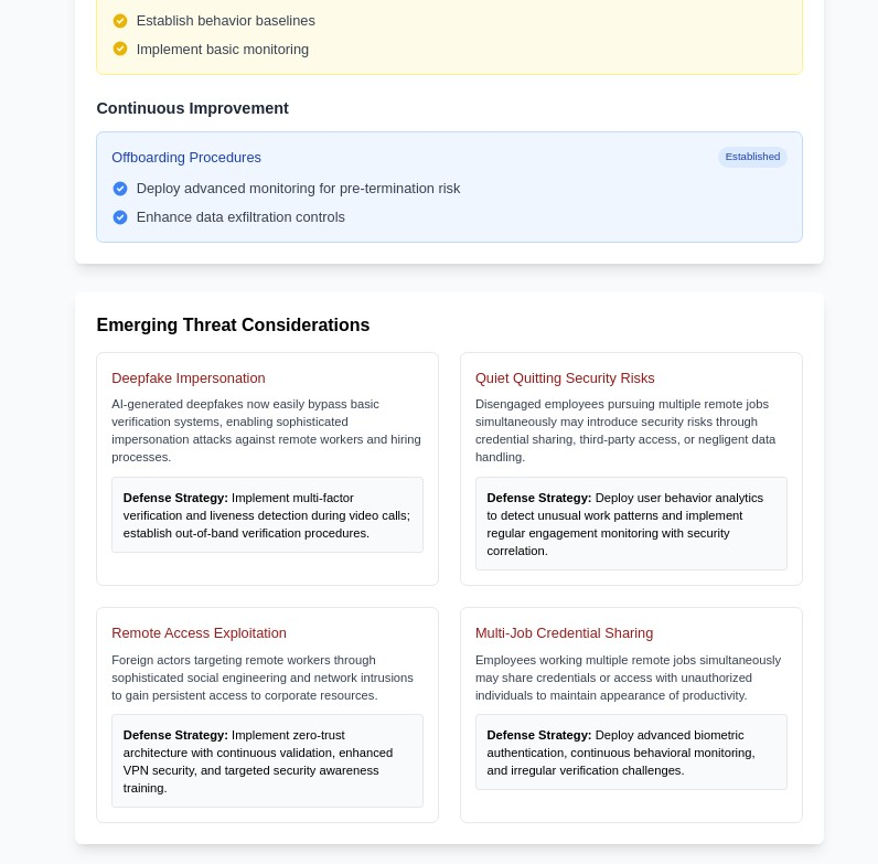 Implement advanced monitoring during critical transition periods. Pre-termination risk assessment, enhanced monitoring for departing employees, and secure handoff procedures can prevent many common insider threat scenarios.
